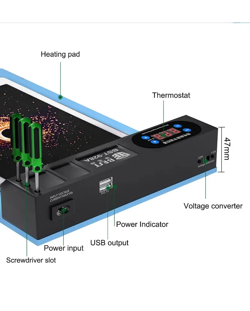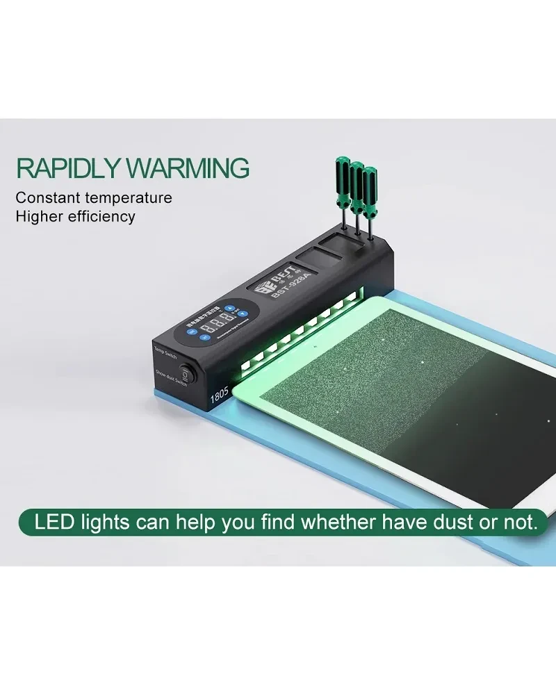 BST-928A to profesjonalne narzędzie do bezpiecznego demontażu i rozdzielania ekranów LCD w urządzeniach mobilnych. Produkt dedykowany jest serwisantom telefonów i tabletów, którzy potrzebują precyzji oraz efektywności podczas pracy.